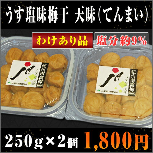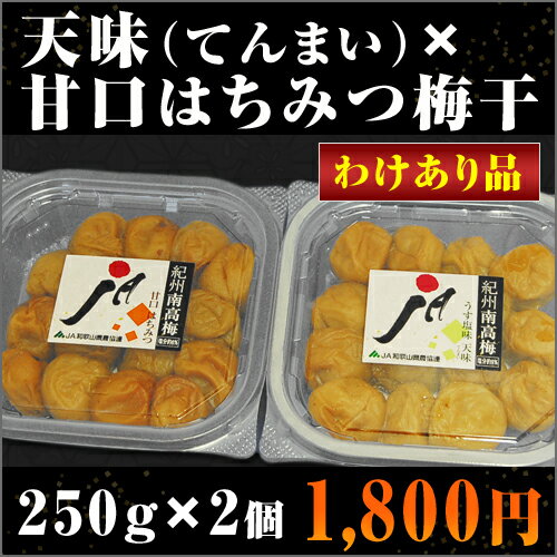 梅の中でも非常に食べやすいものをセットにしました!人気の梅がセットに!訳ありで大特価! 【うす塩味梅干(天味)+甘口はちみつ】 500g(250g×2パック)価格: 1,800円レビュー評価: 0.0 レビュー数:0 セット内容うす塩味梅干 天味(てんまい)塩分9% 原材料:梅、漬け原材料(醗酵調味料、果糖ぶどう糖液糖、食塩、醸造酢、還元水あめ)、調味料(アミノ酸等)、酒精、V.B1甘口はちみつ梅干し 塩分6% 原材料:梅、漬け原材料(三温糖、食塩、蜂蜜、醸造酢)、調味料、酒精、酸味料、甘味料(スクラロース)、V.B1消費期間:製造日より約180日≪重要≫商品の到着は、【本州・四国】は翌日、【北海道・九州】は翌々日となります。ご注意ください。比類なき産地が使命に燃えて・・・作りあげます。JA和歌山県農協連&築地からの直送便スペシャル企画、こだわりの「紀州南高梅の梅干(極上品)」 【人気のブランド梅干 うす塩 |